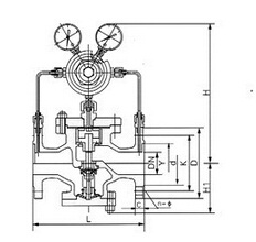 YK43X气体减压阀属于先导活塞式减压阀.由主阀和导阀两部分组成.主阀主要由阀座、主阀盘、活塞、缸套、弹簧等零件组成。导阀主要由阀座、阀瓣、膜片、弹簧、调节弹簧等零件组成。通过调节调节弹簧压力设定出口压力,利用膜片传感出口压力变化,通过导阀启闭驱动活塞调节主阀节流部位过流面积的大小,实现减压稳压功能。